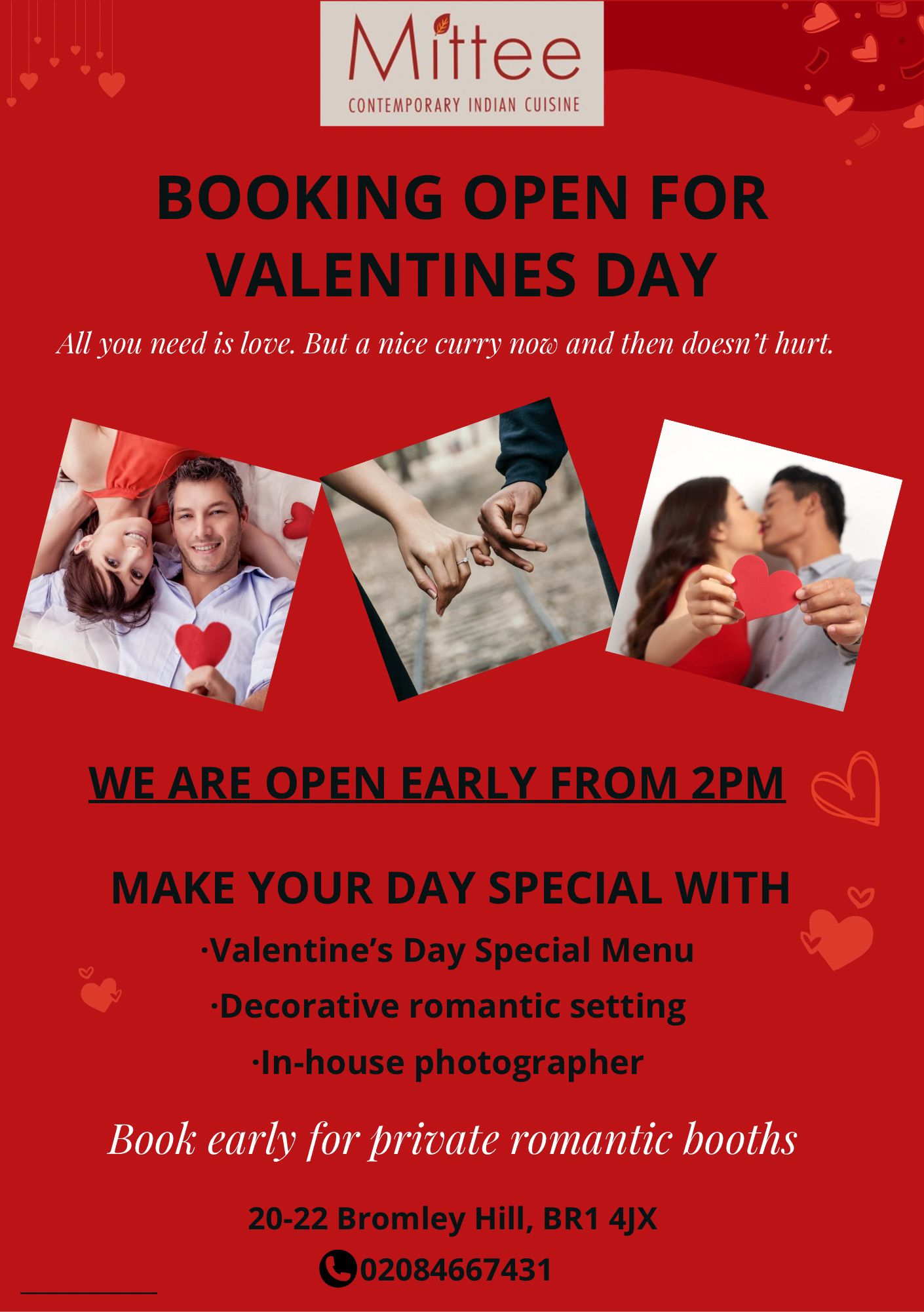 Reservations can be made by calling us directly at 020 8466 7431 or you can book online in our website. We recommend booking in advance, especially for weekends and special occasions.
